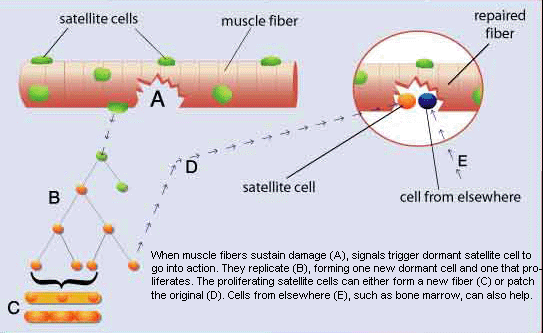 Usually these cells are dormant, but they become activated when the muscle fiber receives any form of trauma, damage or injury, such as from resistance training overload. The satellite cells then proliferate or multiply, and the daughter cells are drawn to the damaged muscle site. They then fuse to the existing muscle fiber, donating their nuclei to the fiber, which helps to regenerate the muscle fiber.