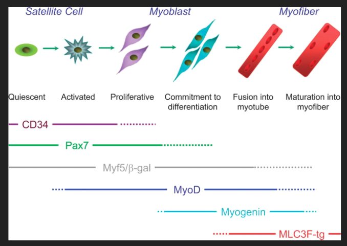 대개 이 세포들은 평소에 휴면기이지만 근섬유가 타박상, 손상을 받을때 활성화됨. 근육세포가 손상되면 위성세포는 증식하고, 딸세포(daughter cell)는 손상된 근육부위로 이동함. 그리고 근섬유를 연결하고 근섬유에 핵을 만들고 근섬유 재생을 도움.