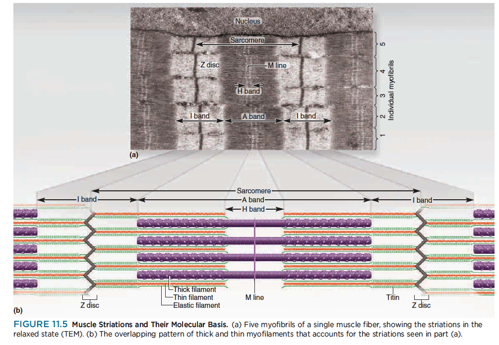 3. Elastic filaments (see fig. 11.5b), 1 nm in diameter, are made of a huge springy protein called titin3