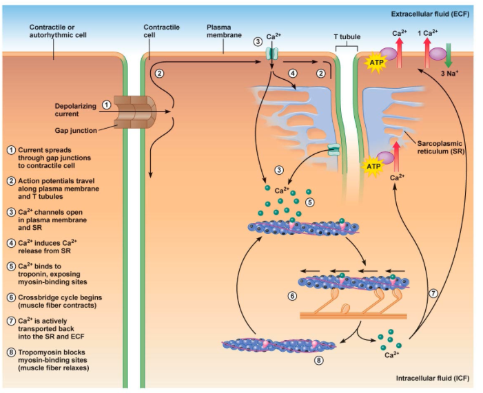 전도성 : 근섬유 자극은 국소적인 효과보다 멀리 생성됨. 국소적인 전기변화는 근섬유를 따라 빠르게 이동하고 흥분파가 전달되어 초기 자극을 따라서 근수축이 일어남.