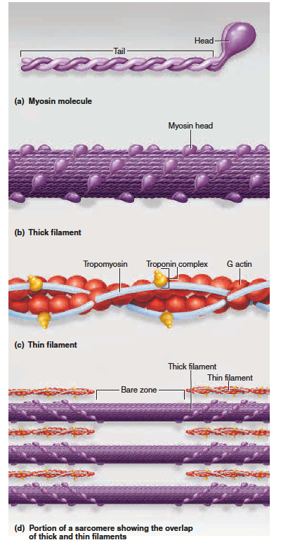 1. Thick filaments (fig. 11.3a, b, d) are about 15 nm in diameter. Each is made of several hundred molecules of a protein called myosin. A myosin molecule is shaped like a golf club, with two chains intertwined to form a shaftlike tail and a double globular head projecting from it at an angle. A thick filament