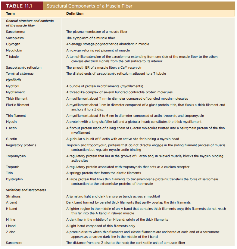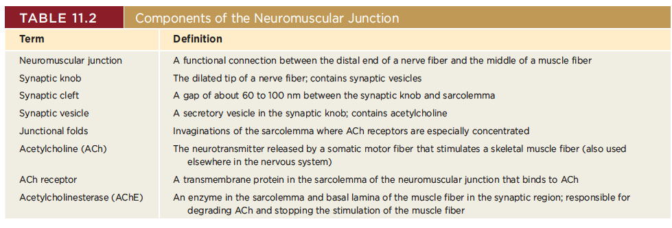 You must be very familiar with the foregoing terms to understand how a nerve stimulates a muscle fiber and how the fiber contracts. They are summarized in table 11.2 for your later reference.