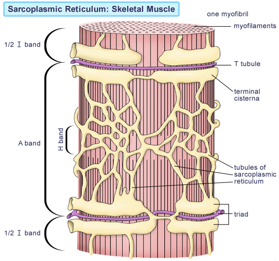 each myofibril. It periodically exhibits dilated end-sacs called terminal cisternae, which cross the muscle fiber from one side to the other.