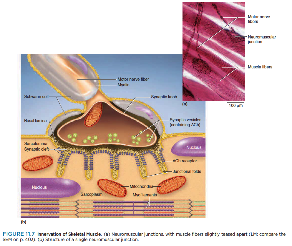 The point where a nerve fiber meets its target cell is called a synapse (SIN-aps). When the target cell is a muscle fiber, the synapse is called a neuromuscular junction (NMJ), or motor end plate (fig. 11.7).