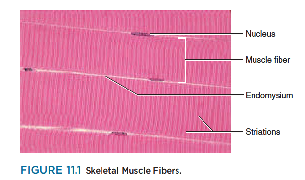 Skeletal muscle may be defined as voluntary striated muscle that is usually attached to one or more bones. A skeletal muscle exhibits alternating light and dark transverse bands, or striations (fig. 11.1), that result from an overlapping arrangement of their internal contractile proteins.