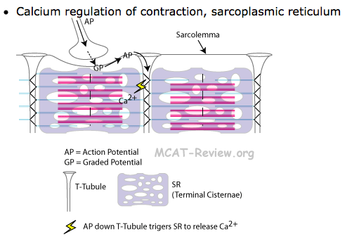 The SR is a reservoir of calcium ions; it has gated channels in its membrane that open at the right times to release a flood of Ca2 into the cytosol, where the calcium activates the muscle contraction process. The T tubule signals the SR when to release these calcium bursts.