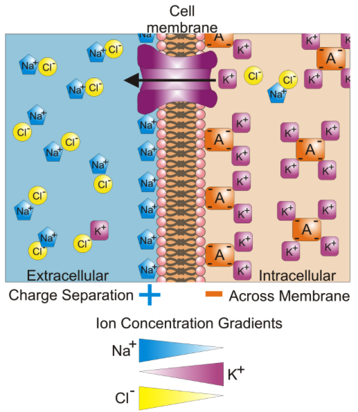 Muscle fibers and neurons are regarded as electrically excitable cells because their plasma membranes exhibit voltage changes in response to stimulation. The study of the electrical activity of cells, called electrophysiology, is a key to understanding nervous activity, muscle contraction, the heartbeat, and other physiological phenomena. The details of electrophysiology are presented in chapter 12, but a few fundamental principles must be introduced here so you can understand muscle excitation. In an unstimulated (resting) cell, there are more anions (negative ions) on the inside of the plasma membrane