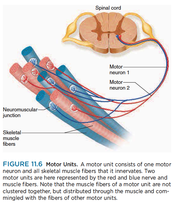 The muscle fibers of a single motor unit are not clustered together but are dispersed throughout a muscle. Thus, when they are stimulated, they cause a weak contraction over a wide area—not just a localized twitch in one small region. An effective muscle contraction usually requires the activation of several motor units at once.