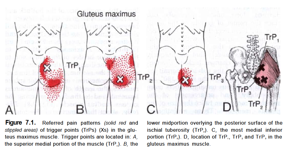 2. 임상에서 대둔근 통증은 흔하다. 대개는 허리디스크로 인한 좌골신경통, 후관절, 천장관절 문제로 인한 연관통이다.  TrP통증도 많다.