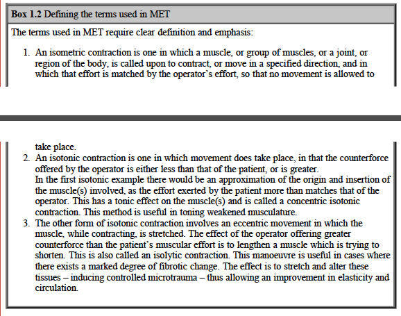 Sandra Yale (in DiGiovanna 1991) acknowledges that, apart from the well understood processes of reciprocal inhibition, the precise reasons for the effectiveness of MET remain unclear – although in achieving PIR the effect of a sustained contraction on the Golgi tendon organs seems pivotal, since their response to such a contraction seems to be to set the tendon and the muscle to a new length by inhibiting it (Moritan 1987). Other variations on this same theme include ‘hold–relax’ and ‘contract–relax’ techniques (see Box 1.1).