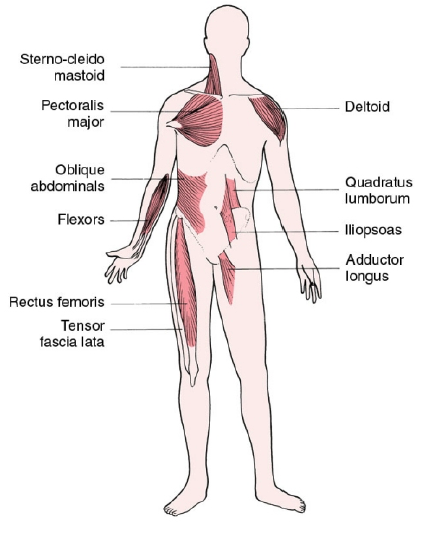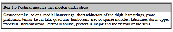 The muscles which shorten are said to be those which have a primarily postural rather than phasic (active, moving) role and it is possible to learn to conduct, in a short space of time (10 minutes or so) an assessment sequence in which the majority of these can be identified as being either short or