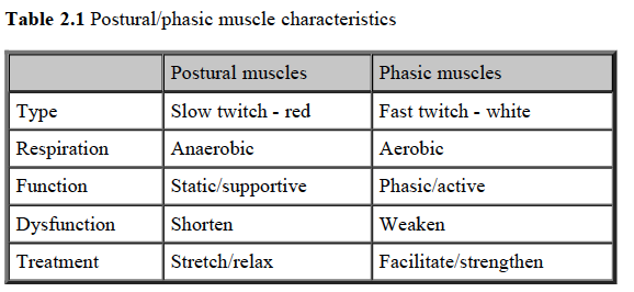Embedded in the descriptions of these muscle groupings in some of the writing about them is the assumption that postural muscles have a predominance of type I fibres, and phasic muscles type II. All muscles comprise both red (type I) and white (type II), slow and fast, fibres which produce both postural and phasic functions; however, the classification of a muscle into either a ‘postural’ or ‘phasic’ group is made on the basis of their predominant activity, their major functional tendency. Norris (personal communication, 1999) states: