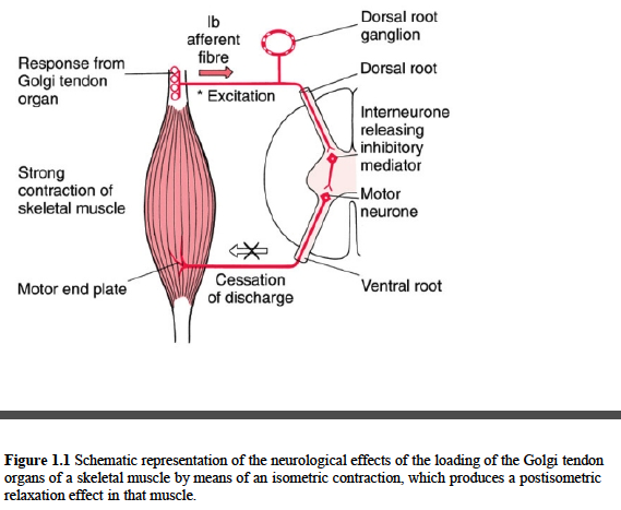 Lewit & Simons (1984) agree that while reciprocal inhibition is a factor in some forms of therapy related to postisometric relaxation techniques, it is not a factor in PIR itself, which is a phenomenon resulting from a neurological loop, probably involving the Golgi tendon organs (see Figs 1.1 and 1.2).