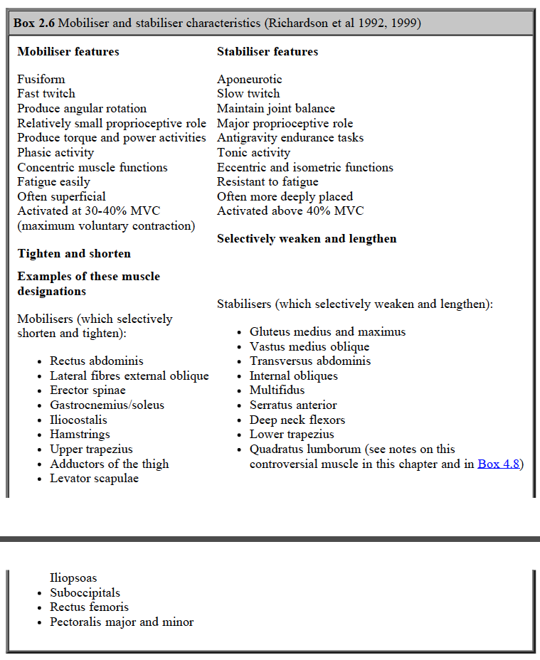 In the mobiliser/stabiliser model some muscles seem to act as both. Norris (2000) states: