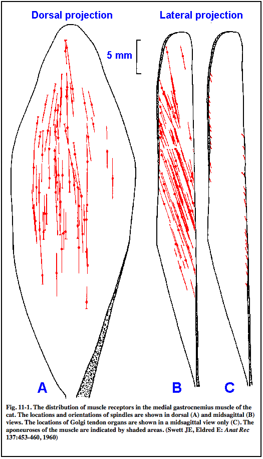 Figure 11-1 shows the distribution of spindles in the medial gastrocnemius of the cat, in dorsal (A), and midsagittal projections (B), and for comparison the location of Golgi tendon organs (C).