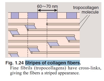 Collagen fiber molecules are produced in the rough endoplasmic reticulum of fibroblasts. Helical procollagens with three a-chains are secreted and the molecular ends are cut by procollagen peptidase to become tropocollagens. The molecules are crosslinked to each other with a regular gap that forms the striped collagen fiber (Fig. 1.23b).