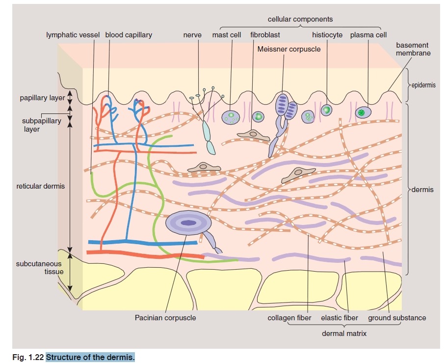 the dermal matrix formed by cells in the interstitial components (Fig. 1.22). The major components mainly consist of collagen fibers (mainly types I and III), with smaller amounts of elastic fibers, reticular fibers and matrix. This matrix generally comprises the extra-cellular matrix and ground substance made up of proteoglycans and gelatin. Fibroblasts, macrophages, mast cells, plasma cells, vascular channels and nerves are common cellular components.