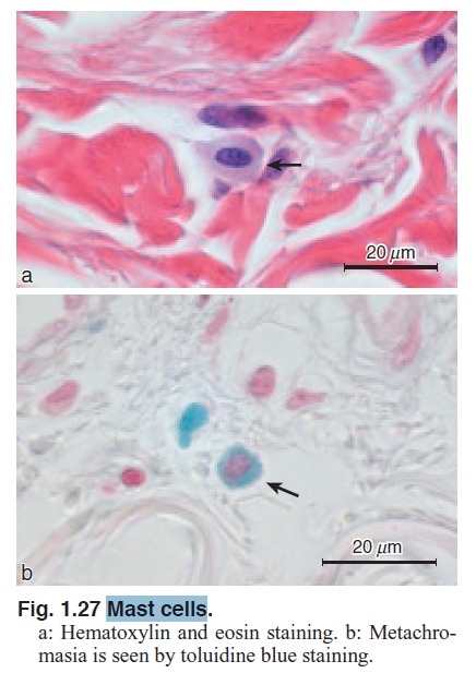 The mast cell is found in the dermis around capillaries and in the periphery of subcutaneous tissues. The shape is roundish or spindled, and the diameter is 10 mm (Fig. 1.27). Mast cells produce and maintain various vasodilatory and hyperlucent chemical mediators. Mast cell granules stain red-violet in toluidine blue and methylene blue, and present with metachromasia. Cutaneous mast cells resemble basophils in form and function; however, their characteristics differ slightly from those of other organs, because they differentiate in skin during intrauterine life.