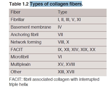 Twenty subtypes of collagen molecules with a-chains of different molecular structures are known to exist (Table 1.2); however, type I collagen accounts for 80% of the collagen fibers that make up the dermis. Reticular fibers, which distribute in the perivascular regions as thin argyrophilic fibers and do not form thick fiber bundles, are type III collagen, and these account for about 15% of all fibers. Most of the remainder is thought to be type V collagen. Types IV, VII and XVII are mainly found in the basal membranes, associated with epidermal keratinocytes.