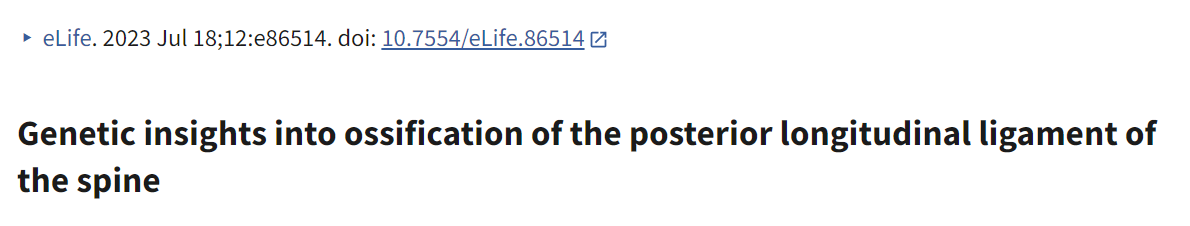 | Genetic insights into ossification of the posterior longitudinal ligament of the spine | Yoshinao Koike et al. | 2023년 7월 18일 | eLife (IF ~8.0) | GWAS 메타분석으로 14개 유전자좌 식별(8개 신규). 면역/혈액 세포 그룹에서 신호 강화, 대식세포 등 면역 세포가 염증-조직 수복에 관여. 비만(BMI)과 BMD가 인과적 원인으로 확인되어 전신적 요인 지지. OPLL을 다인자성 질환으로, 만성 염증과 유사하지만 강직성 척추염(AS)과 유전적 중복 없음. |