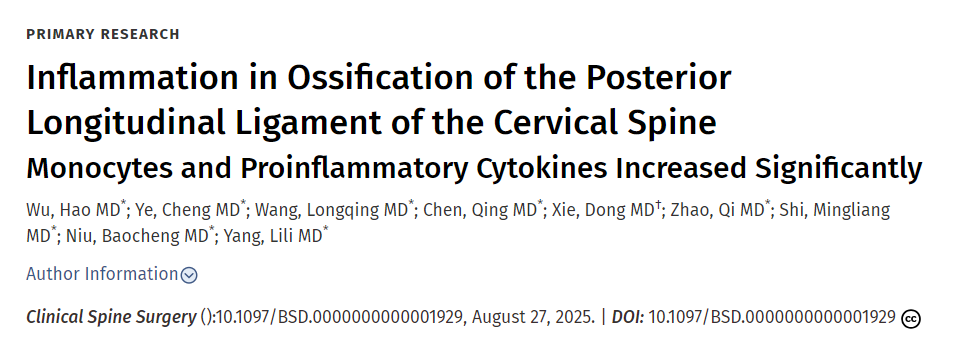 | Inflammation in Ossification of the Posterior Longitudinal Ligament: A Prospective Cohort Study | Hao Wu et al. | 2025년 8월 27일 | Clinical Spine Surgery (Lippincott, IF ~2.5) | OPLL 환자에서 말초혈액 단핵구와 프로염증 사이토카인(IL-1β, TNF-α, MCP-1) 증가, 항염증 IL-10 감소 확인. 이는 OPLL의 병인에 만성 염증 반응이 관여함을 시사하며, 전신적 염증 과정으로 지지. |