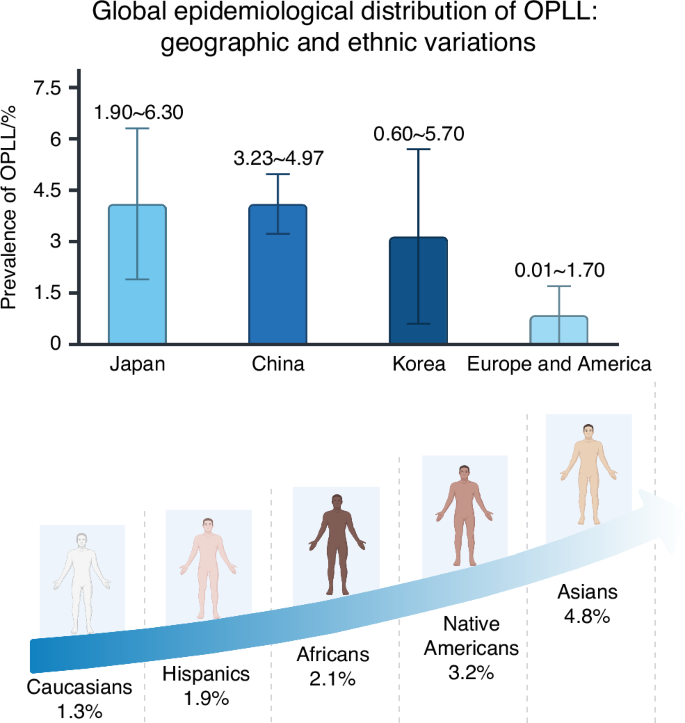 예를 들어, 경추 OPLL(C-OPLL)의 유병률은 일본인에서 1.9%~6.3%, 한국인에서 0.6%~5.7%로 보고되었으며, 중국인 집단에서는 평균 4.1%의 유병률이 관찰되었다. 7 반면 미국 및 유럽을 포함한 서양 인구의 유병률은 0.01%에서 1.7%로 훨씬 낮습니다.8 특히, 다양한 인종 집단 간 OPLL 유병률을 비교한 단면 연구에서 아시아계 미국인도 가장 높은 유병률을 보였으며, 이는 유전적 및 민족적 요인의 영향을 강조합니다9 (그림 2).
