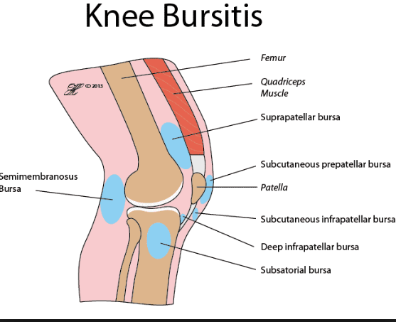 3. 점액낭염 발생 부위 : 전슬개 점액낭염, 슬개하 점액낭염, 대전자 점액낭염, 주두 점액낭염, 견봉하 점액낭염(통증극심), 아킬레스 종골 점액낭염, 좌골 점액낭염, 거위발 점액낭염 등