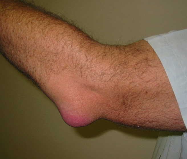 - Olecranon bursitis, "student's elbow", characterised by pain and swelling in the elbow