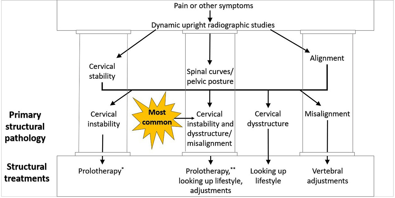 Figure 12. Cervical treatment recommendations based on dynamic upright radiographic studies. Patients often have a combination of cervical instability, cervical dysstructure (breakdown of cervical curve), and misalignments, the 3 pillars of cervical structural health. * Some extreme cases of instability require surgery or other methods. ** Optimizing cervical curve is multifaceted and can include ergonomics, physical therapy and exercise, and many other physical medicine techniques.