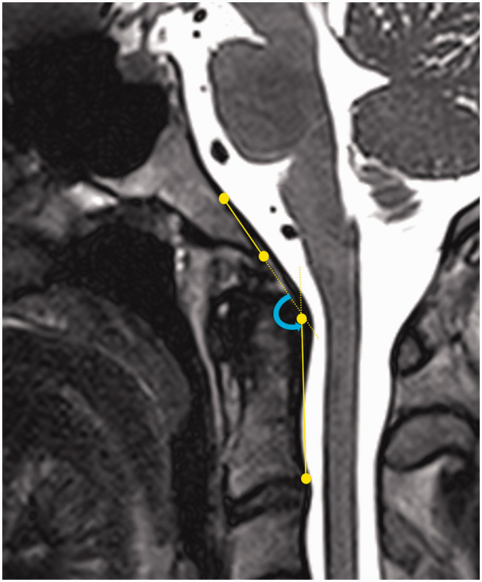Clivo-axial angle(clivo-cervical angle) 150가 정상. 130도 이하는 심한 뇌간압박 초래.. --> 자율신경이상, 경동맥-미주신경압박이 될수 있다!!