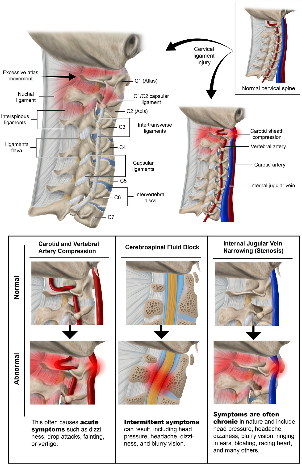 The potential seriousness of LCI is amplified when one considers that all of the major neurovascular structures from the body that enter and leave the brain and brainstem, including the autonomic ganglia, do so through the neck. The neck is thus a conduit for fluid and nerve flow that run the body through the brain and brainstem. LCI can disrupt this fluid and nerve flow and can explain many resulting chronic symptoms, disorders, syndromes, and diagnoses that plague humanity.