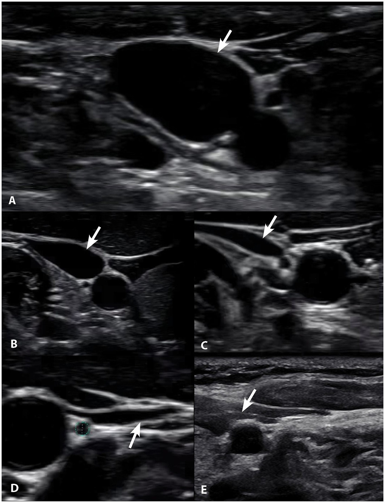 Figure 10. Degrees of internal jugular vein compression as seen on ultrasound examination of the neck. (A) Normal, “open” internal jugular vein. (B) Slightly compressed. (C) Moderately compressed. (D) Severely compressed. (E) Completely closed. It is internal jugular vein compression (arrows), especially with upright posture and neck motions, that leads to intracranial hypertension (increased brain pressure).