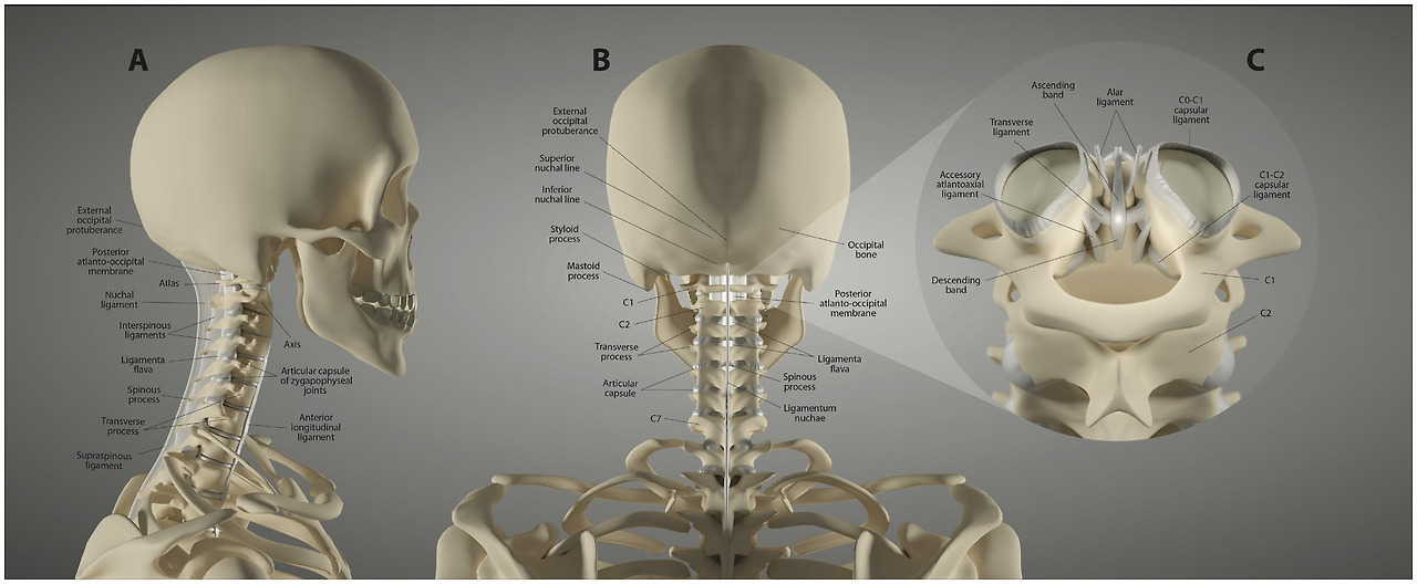 Figure 2. Ligament anatomy of the neck. (A) Lateral view. (B) Posterior view. (C) Upper cervical posterior view.