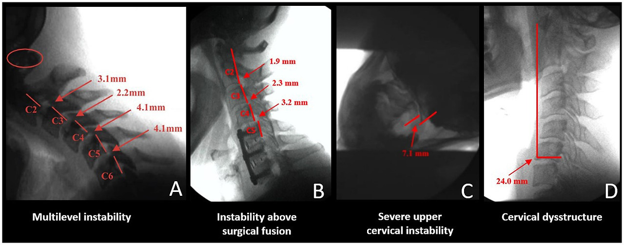 Figure 7. Common cervical digital motion (fluoroscopy) findings. (A) Multilevel cervical instability. (B) Instability above the level of a surgical or degenerative fusion. (C) Upper cervical instability at C1-C2 facet joints. (D) Cervical dysstructure.