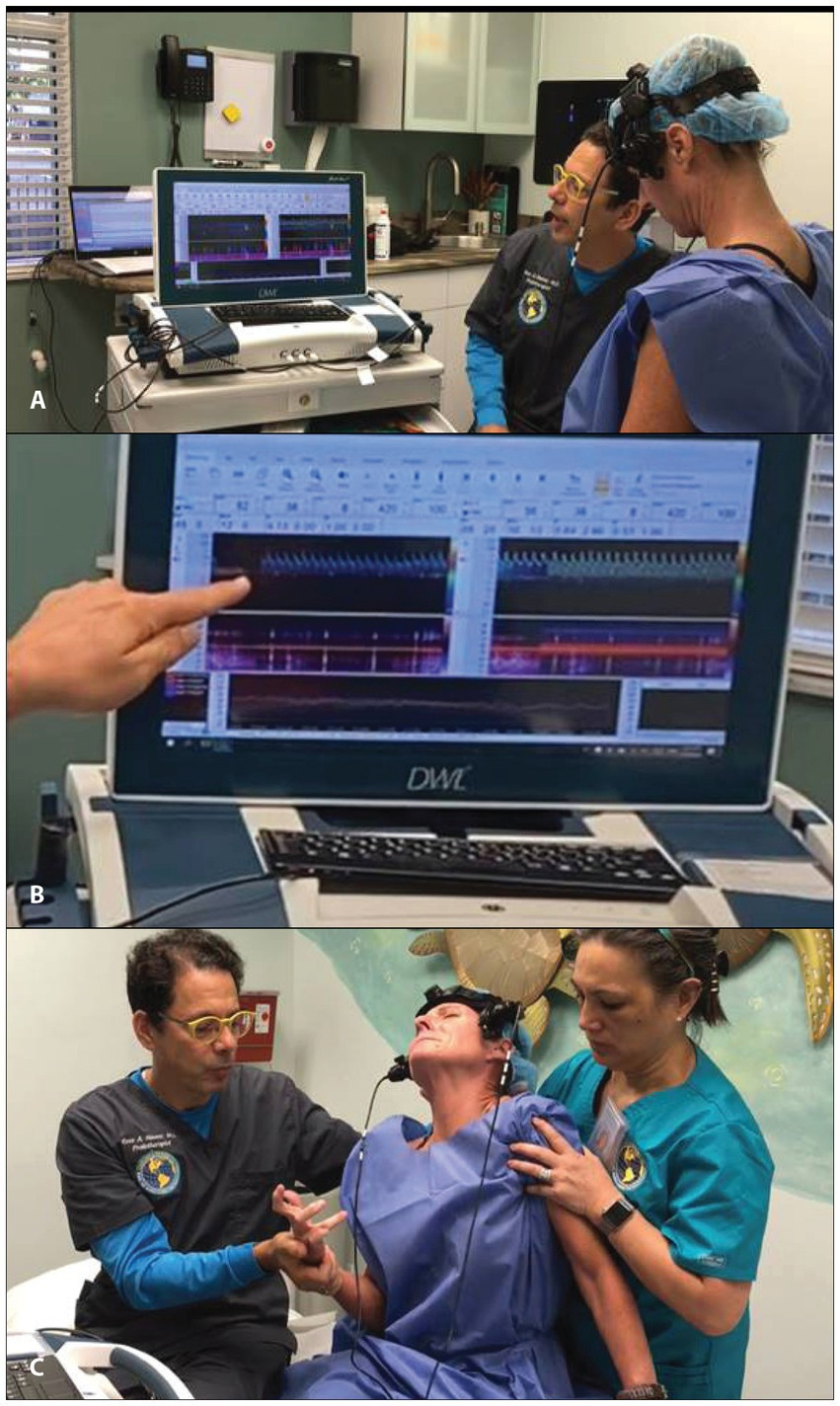 Figure 9. Motion transcranial Doppler monitoring. (A) Watching monitor while patient moves their neck. (B) Blood flow noted to be stopped in the middle cerebral artery. (C) Patient shown shortly after having a dystonic storm.