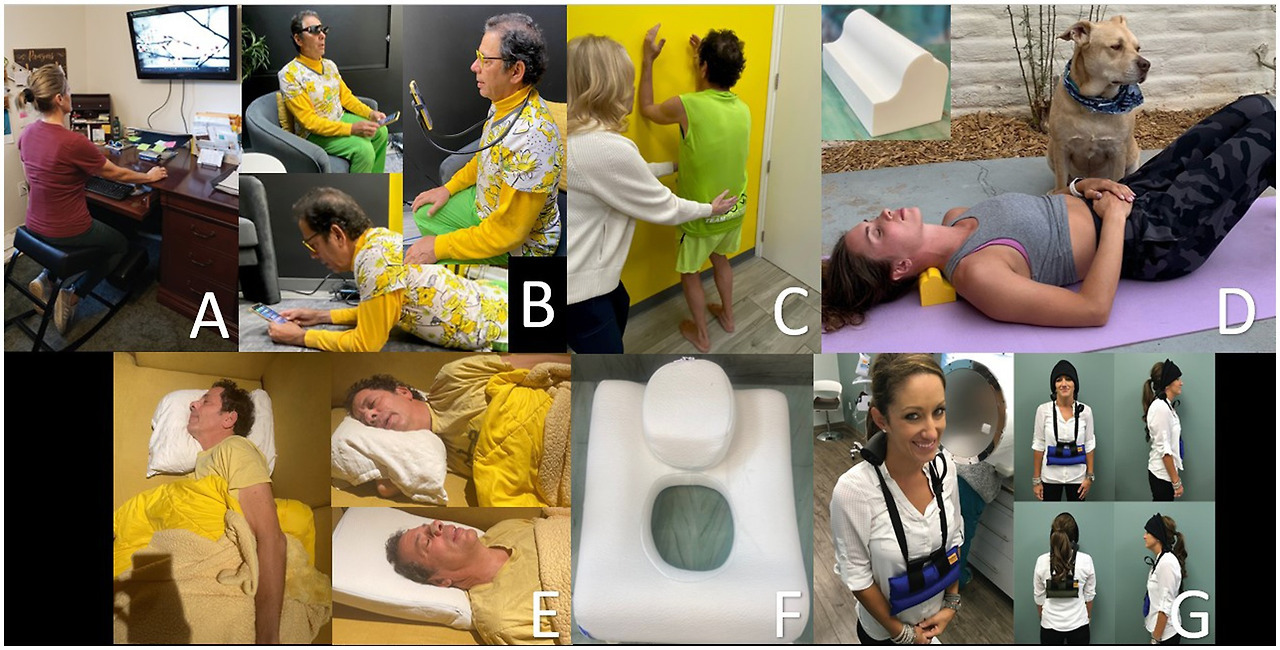Figure 13. Methods to improve one’s cervical curve. (A) Proper workstation. (B) Proper looking-down posture. (C) Postural exercises. * (D) Laying on Denneroll®. (E) Proper sleep position. (F) Pillow with cut-out. (G) Wearing neck weights. * Postural restoration institute.
