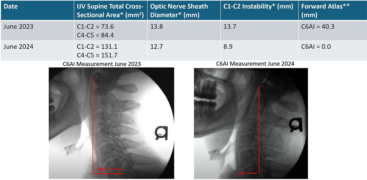 Figure 15. Improvement in patient’s cervical curve structure correlates with opening of his internal jugular veins and reduction in optic verve sheath diameter. Over the course of a year, his brain and mental health symptoms improved significantly. * Mean bilateral total internal jugular vein (IJV) cross-sectional areas (CSAs), optic nerve sheath diameters (ONSDs), and C1-C2 facet joint instability in patients with various brain/mental health symptoms. Normal for IJV CSA is 180 mm2, ONSD is <12.2 mm, and optimal C1 overhang on C2 in lateral flexion, open mouth is <2–4 mm. ** C6A1 = C6-atlas interval, horizontal distance in the sagittal plane of the posterior inferior C6 vertebra to anterior atlas (optimal is <10 mm). This measurement shows how far forward the atlas (C1) is in relation to the lower cervical vertebra (C6).