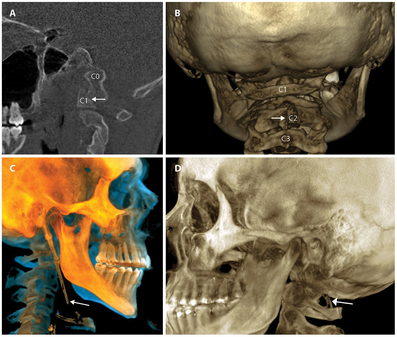Figure 6. Common pathology seen by upright cone beam CT scan of head and neck. (A) CO-C1 instability. (B) Cervical spine misalignments. (C) Elongated styloid. (D) Ponticulus posticus.