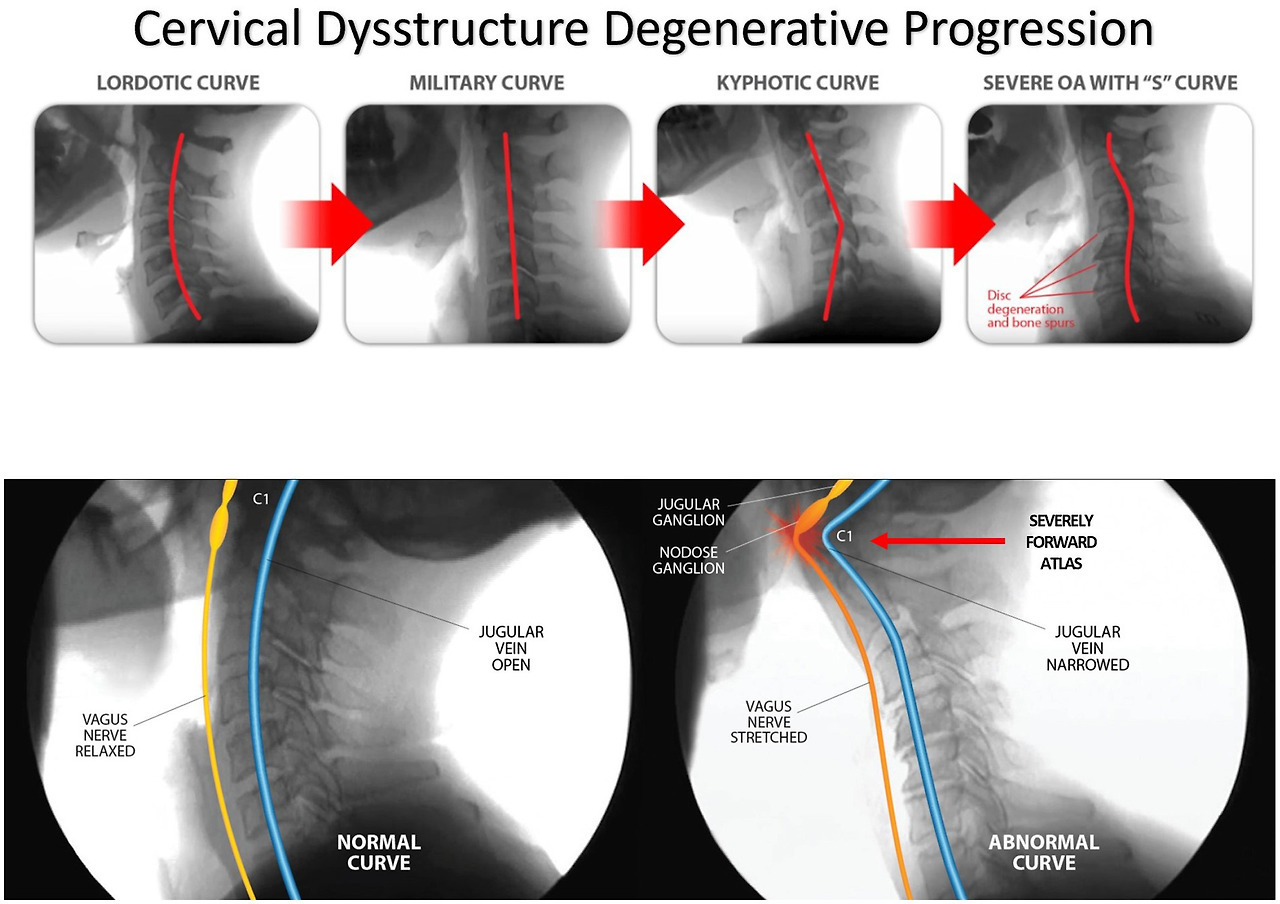 Figure 3. Ligamentous cervical instability is a progressive disorder causing a normal lordotic curve to break down, ultimately leading to an “S” or “sigmoid” curve and potentially compressing the structures in the carotid sheath, including the vagus nerves and internal jugular veins.