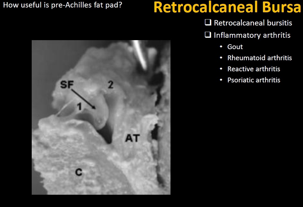 - synovial invagination은 아킬레스건과 종골을 둘로 구분함.