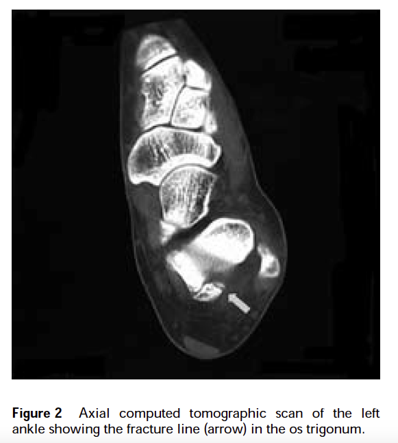 The os trigonum is an inconsistently present accessory bone of the foot situated at the posterolateral aspect of the talus. It may be radiographically confused with fractures of the posterior process of the talus. Fracture of the os trigonum per se is extremely rare. Hyperplantarflexion of the ankle is the mechanism of injury in which the os trigonum is compressed between the posterior malleolus of the tibia and the tuber calcaneus. Computed tomography is the choice of imaging modality in cases where fractures of posterior talus structures, including the os trigonum, are suspected. A high index of suspicion is necessary to diagnose a fracture of the os trigonum after a severe plantarflexion injury to the ankle. Conservative treatment is usually successful. We report a case of a fracture of the os trigonum, its clinical features, treatment and significance.