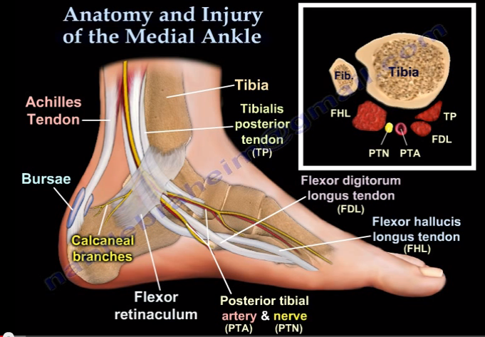2. 내측부 구조 : tibialis posterior tendon, flexor digitorum longus tendon, flexor hallucis longus tendon, posterior tibial nerve, posterior tibial artery, flexor retinaculum, achilles tendon and bursae