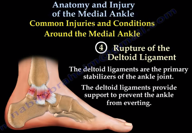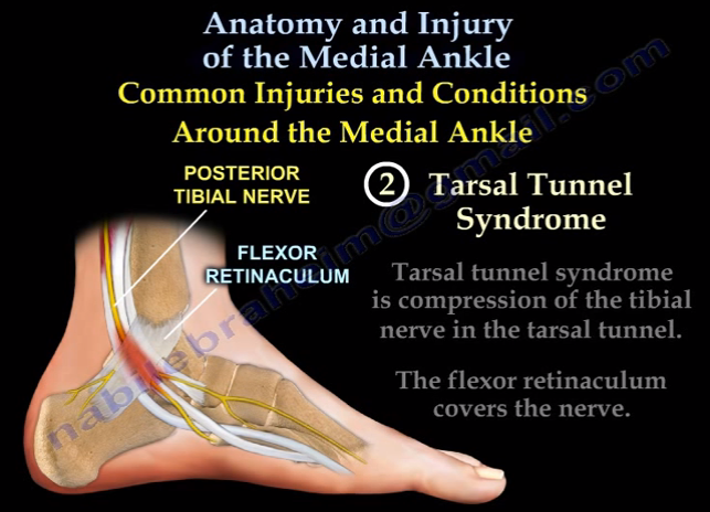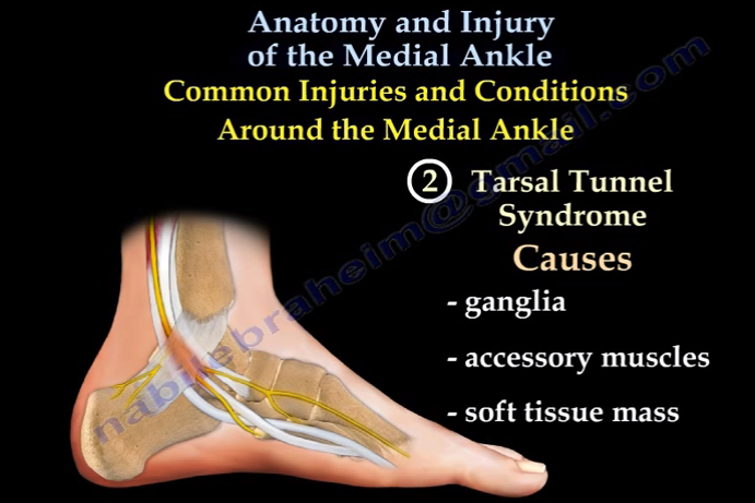 3. 내측부 질환 : 후경골근 건병증(건염, 건증, 건파열), tarsal tunnel syndrome 족근관 증후군, flexor hallucis longus 건병증, deltoid ligament(후경거 전경거 경종 경주인대) sprain