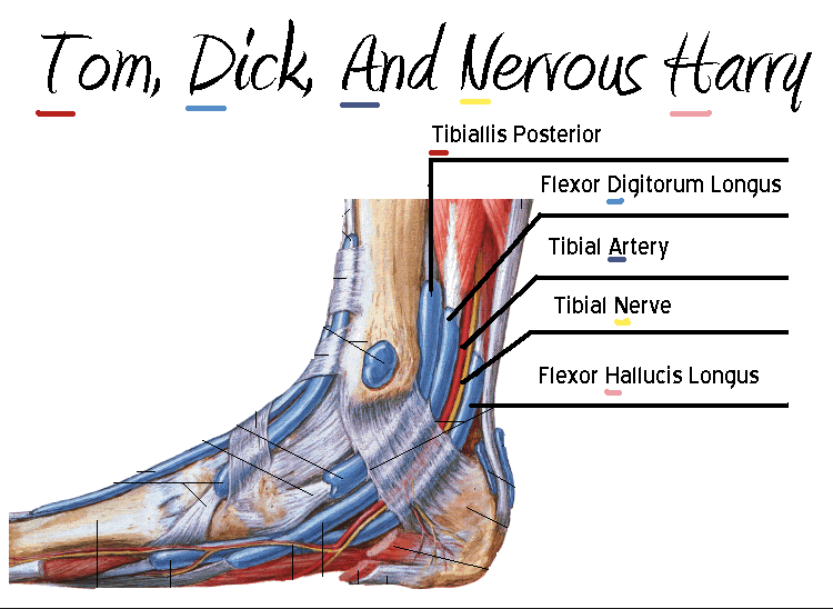 The tibial nerve lies directly posterior to the artery. It divides into two branches after exiting the tarsal tunnel, forming the plantar nerves. The therapist attempts to identify the nerve by hooking around it (like with a guitar string). by using a pointed palpation technique perpendicular to the structure. The nerve rolls away underneath the palpating finger when it has been exactly located. It is not possible to precisely identify the vein using palpation.