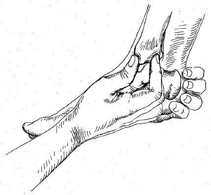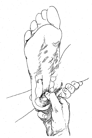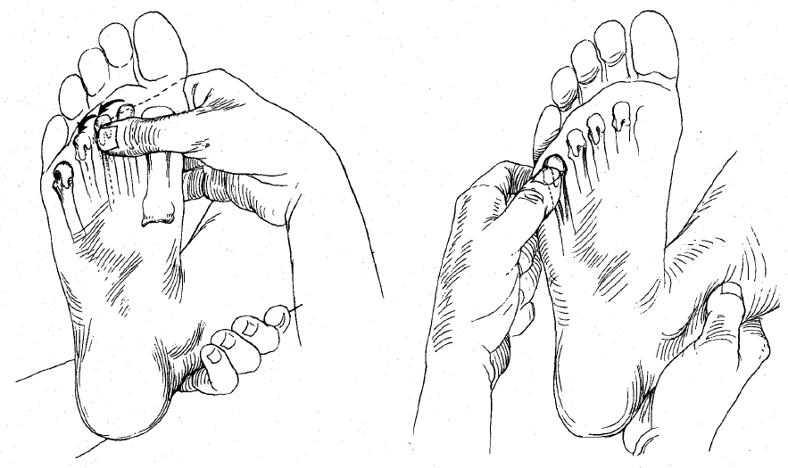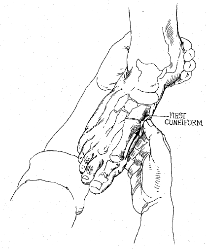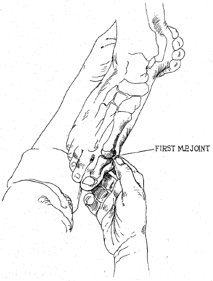 검사자는 엄지손가락을 발바닥(족저부)에, 검지손가락을 발등(족배부)에 놓고 가쪽으로 움직여가면서 각 발허리뼈머리(metatarsal head)를 만져볼 수 있다.