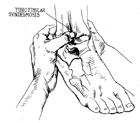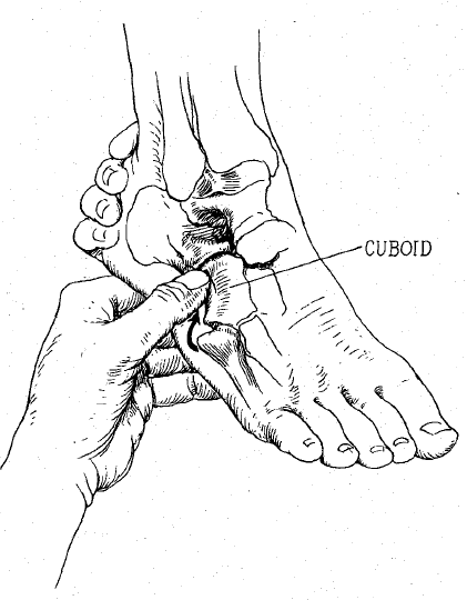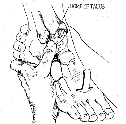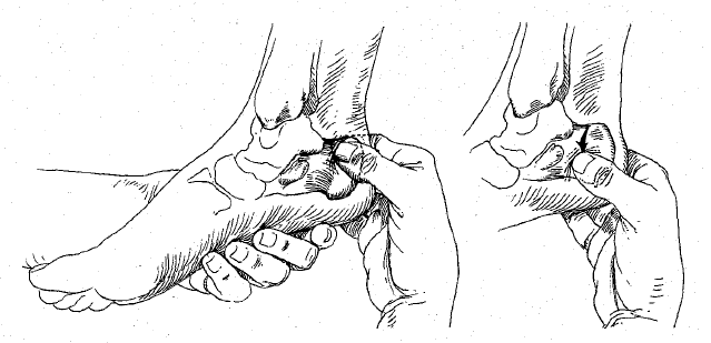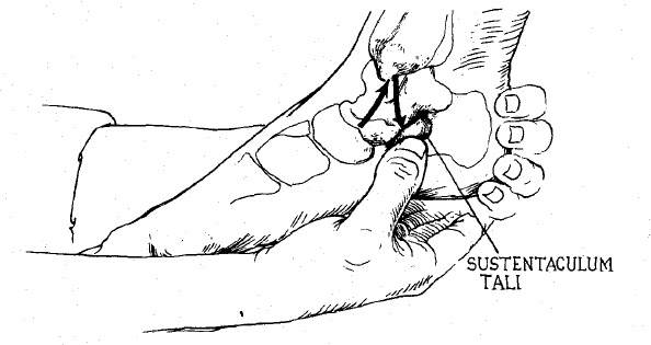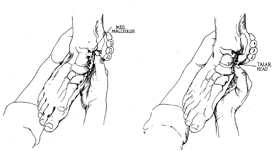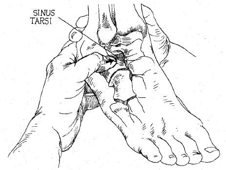 검사자는 한 손으로 환자의 발꿈치뼈를 고정하고 또 다른 한 손의 엄지손가락으로 가쪽복사뼈의 바로 앞쪽에 있는 연부조직이 오목하게 들어간 부위를 만져본다. 이 오목하게 들어간 부위를 발목뼈공동(sinus tarsi)이라 하며 이곳은 짧은발가락폄근(단지신근, extensor digitorum brevis)과 지방 조직으로 차있다.