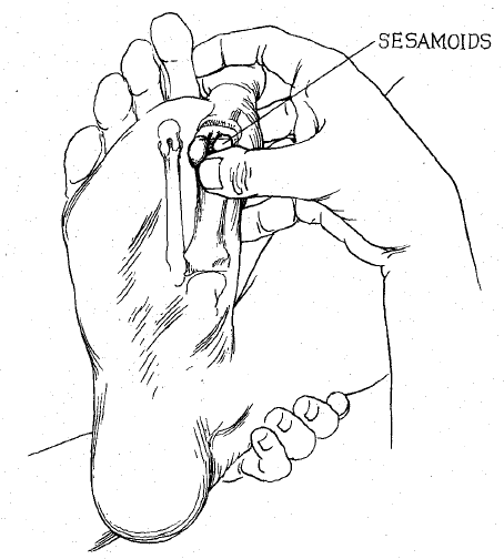 발허리뼈를 강하게 누르면 짧은엄지굽힘근힘줄(단모지굴근건, flexor hallucis brevis tendon) 안에 작은 두 개의 종자뼈를 만져 볼 수 있다.