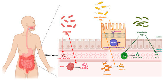 Bilophila spp. and Desulfovibrio spp. promote inflammation via cytokine induction and NF-κB activation, while Roseburia spp. counteract inflammation through Treg-mediated anti-inflammatory pathways.