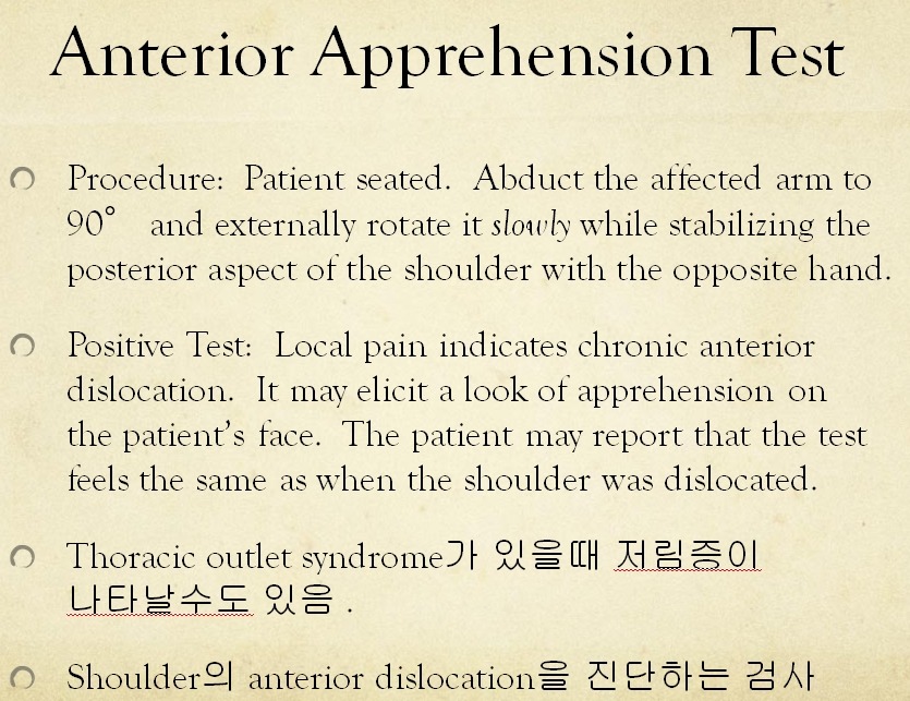 어깨 ant dislocation 검사법. Shoulder Apprehension Test 작성자문형철|작성시간12.02.13|조회수752 목록 댓글 1 글자크기 작게가 글자크기 크게가 Shoulder anterior Apprehension Test어깨의 전방 capsule laxity에 의한 아탈구 검사법http://www.youtube.com/watch?v=qKqJRrms4u8 다음검색 현재 게시글 추가 기능 열기 북마크 공유하기 신고 센터로 신고 댓글 댓글 1 댓글쓰기 답글쓰기 댓글 리스트 작성자윤연우 | 작성시간 13.06.28 감사합니다~~ 댓글 전체보기