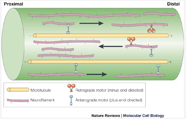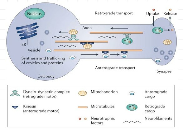 - 예를들어 피부에 염증을 일으킨 헤르페스 virus가 retrograde transport 기전을 통해 cell body까지 도달하는데 걸리는 시간은 하루에 10-20cm씩 이동할 수 있으니 계산해보면 안다.